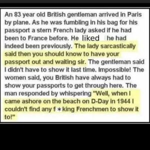 An 83 year old british gentleman arrived in Paris by plane. As he was fumbling in his bag for his passport a stern French lady asked if…