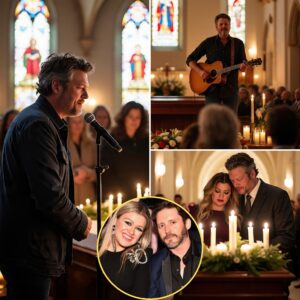 Blake Shelton stood before a hushed crowd and sang “God Gave Me You” in memory of Brandon Blackstock — his former manager and Kelly Clarkson’s ex-husband. The atmosphere inside the church became hauntingly quiet as Shelton’s guitar began to play and his voice trembled with emotion. People in the pews wiped away tears as Shelton turned an old love song into a heartbreaking farewell. Kelly Clarkson, sitting with her children, could not contain her emotions, and sobs echoed throughout the chapel. The children hugged her tightly, both confused and moved by the grief around them and the trembling voice of the man singing his goodbye. When Shelton reached the chorus, the audience fell into stunned silence, shocked by how much a song could convey when words were not enough.