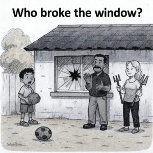 It looks like the boy with the ball most likely broke the window. Here’s why: The broken window has impact cracks that resemble something round hitting it….