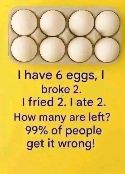 “I have six eggs. I broke two. I fried two. I ate two. How many are left?”