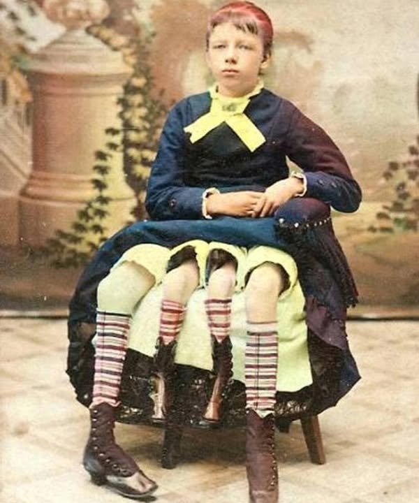 The family led a tranquil existence until their five children reached adulthood. Then Myrtle returned to the entertainment business. Myrtle was 41 years old when she participated in Huber’s Museum display as The Four-Legged Girl from Cleburne, Texas, in 1909. She frequently clothed her four legs in matching shoes and stockings, which delighted the audience. She earned $450 per week at the time.