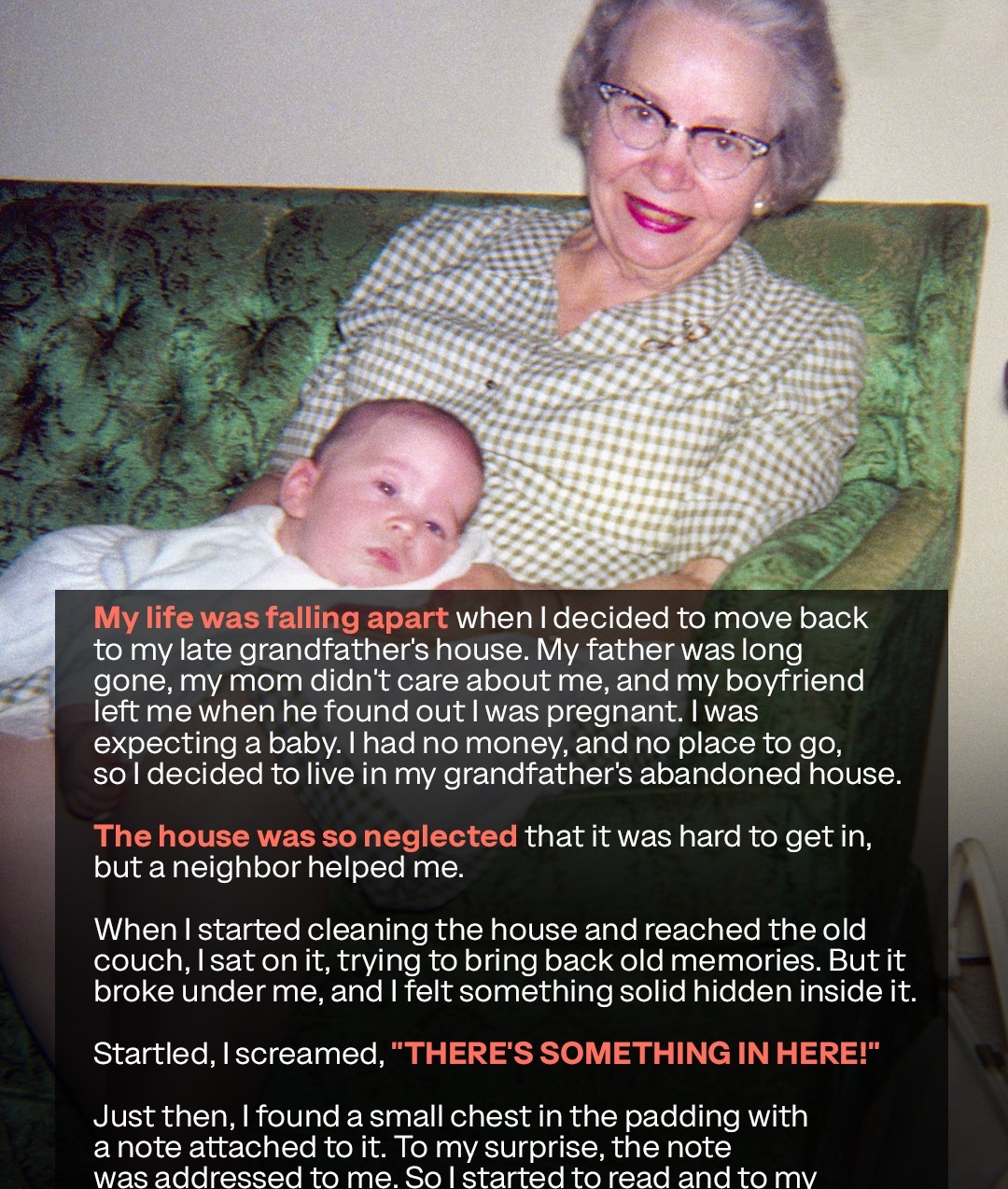 When Victoria returned to her grandfather’s home in Iowa, she noticed his favorite sofa was still residing in the living room. The woman sat on it for a while, remembering her childhood days, then it suddenly cracked. What she discovered inside changed her whole life.