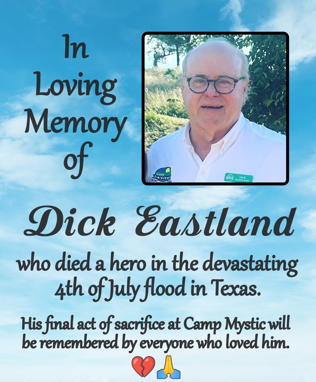 Richard “Dick” Eastland, a Texas summer camp leader who died during deadly flash floods that reportedly began in early July, is being remembered for his final act of courage as communities continue to search for missing children and recover from a disaster that devastated multiple counties.