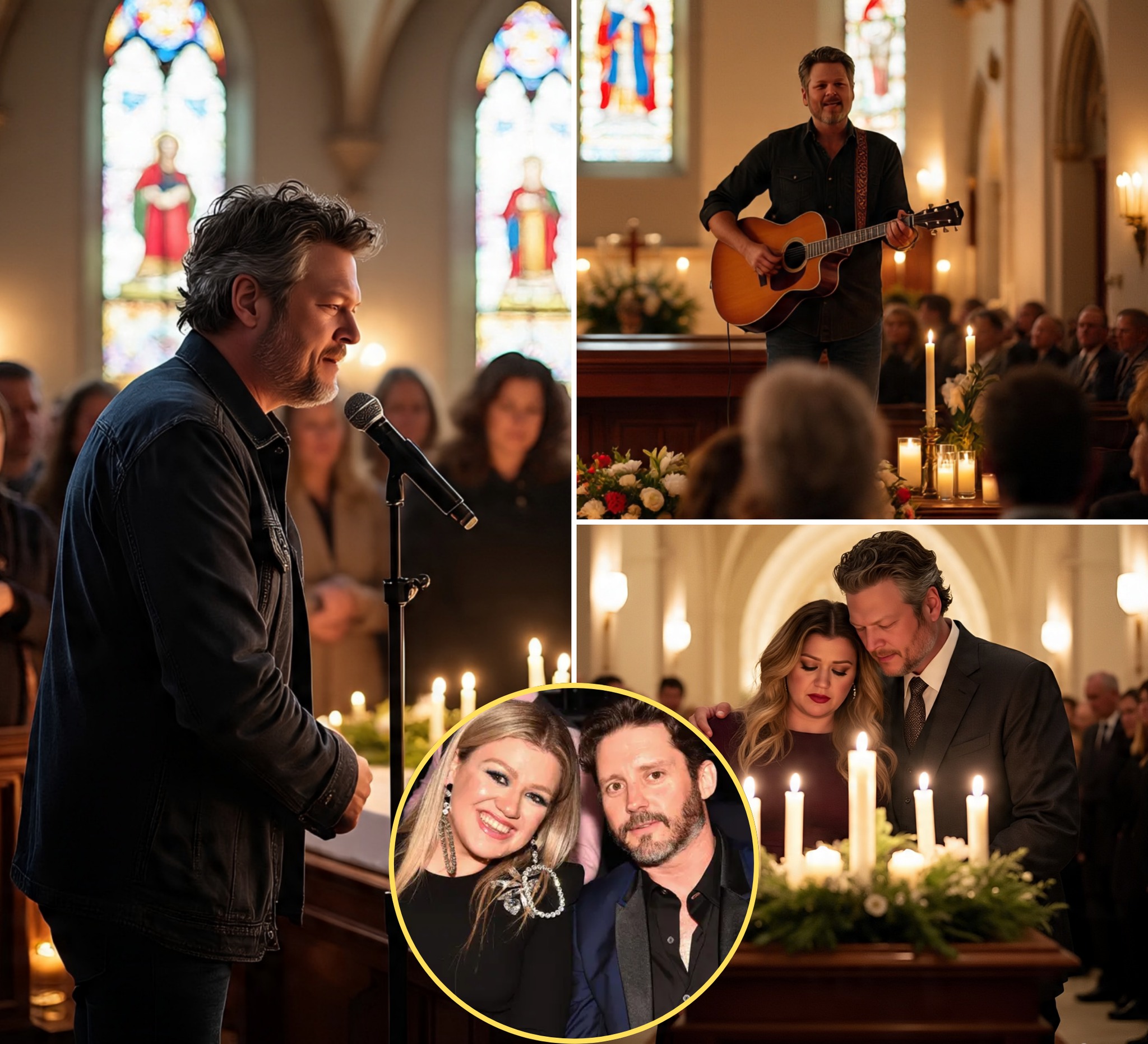 In a tender, imagined tribute blending country music and personal history, Blake Shelton stands before a hushed congregation in a small church, guitar in hand. This fictional scene unfolds at the funeral service of Brandon Blackstock — a gathering where the entertainment world and private lives intersect.