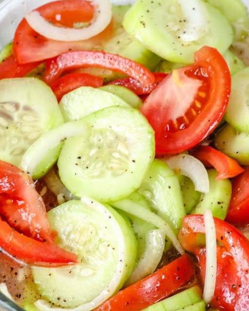Step 6: Serve & Enjoy Spoon the marinated cucumbers, onions, and tomatoes into individual bowls or onto plates. Garnish with additional fresh herbs, if desired, for a pop of color and extra freshness. Serve chilled or at room temperature.