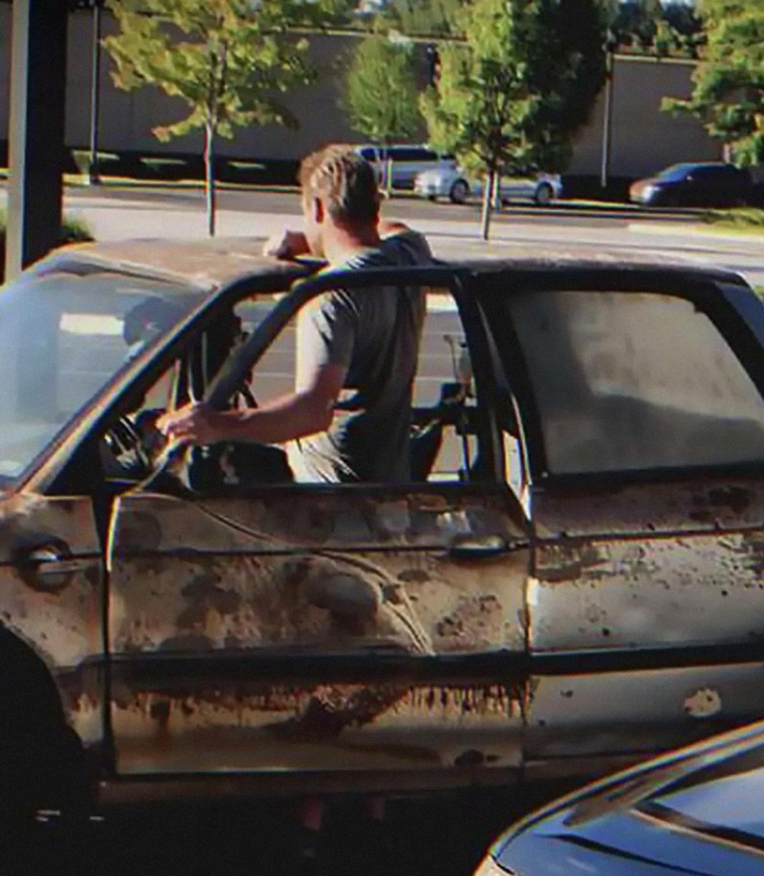 “Well, I see him every day from my office window. He’s wearing these shabby clothes and drives off in an old Mustang that looks like it’s held together with duct tape and prayers.”