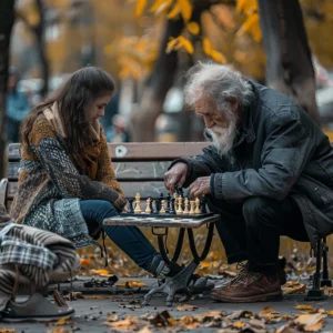 Lost in her thoughts, Jennifer’s attention was captured by an older man playing chess alone at a concrete table. His clothing was nondescript and faded. His hair was gray and unkempt, adding years to his appearance, yet his eyes still had an indomitable spark.