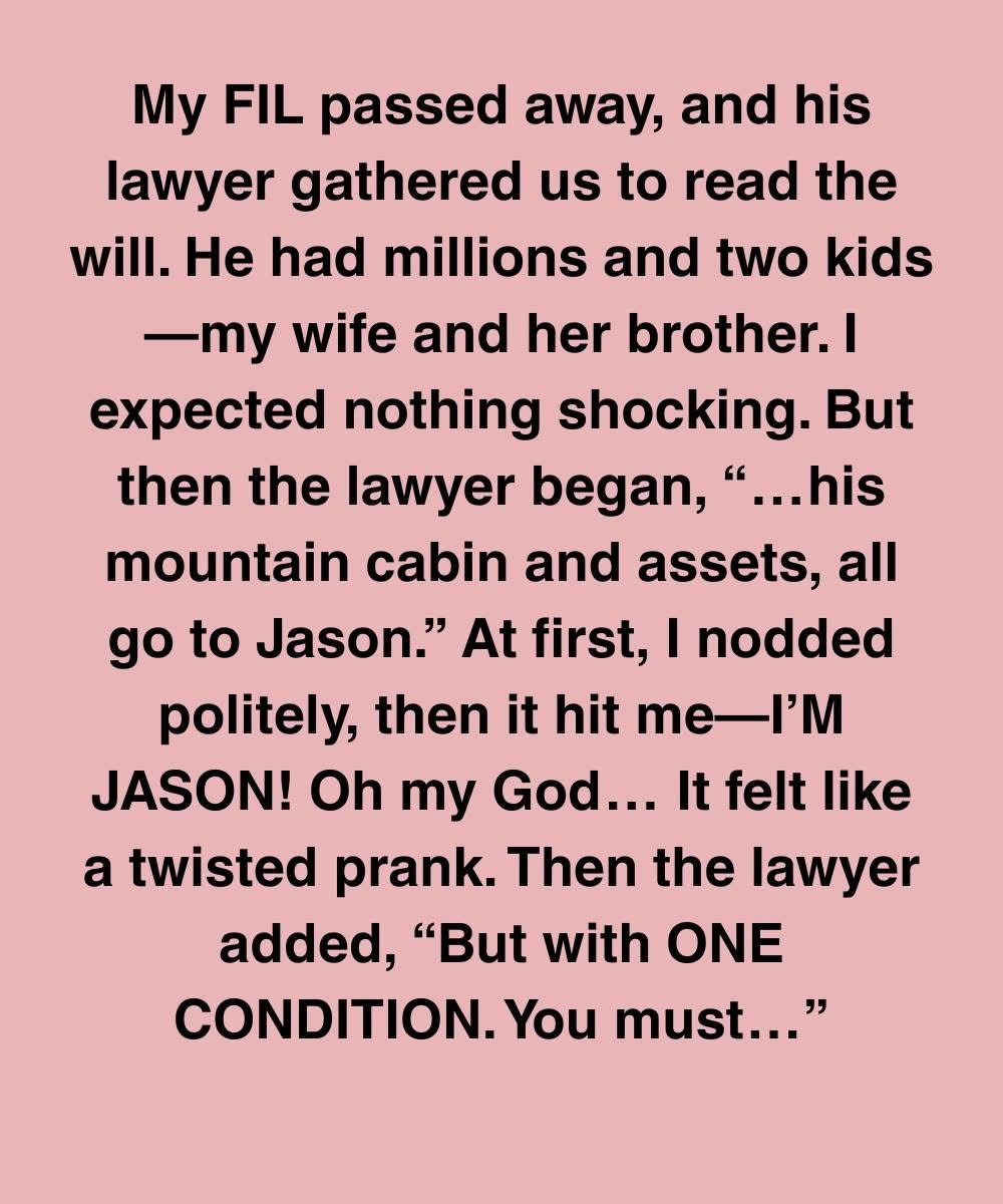 My father-in-law passed away, and his lawyer gathered us to read the will. He had millions and two kids—my wife, Rina, and her brother, Orson. I expected nothing shocking. But then the lawyer began, “…his mountain cabin and assets, all go to Jason.” At first, I nodded politely, then it hit me—I’M JASON! Oh my God… It felt like a twisted prank. Then the lawyer added, “But with ONE CONDITION. You must live in the mountain cabin for one full year. Alone.”