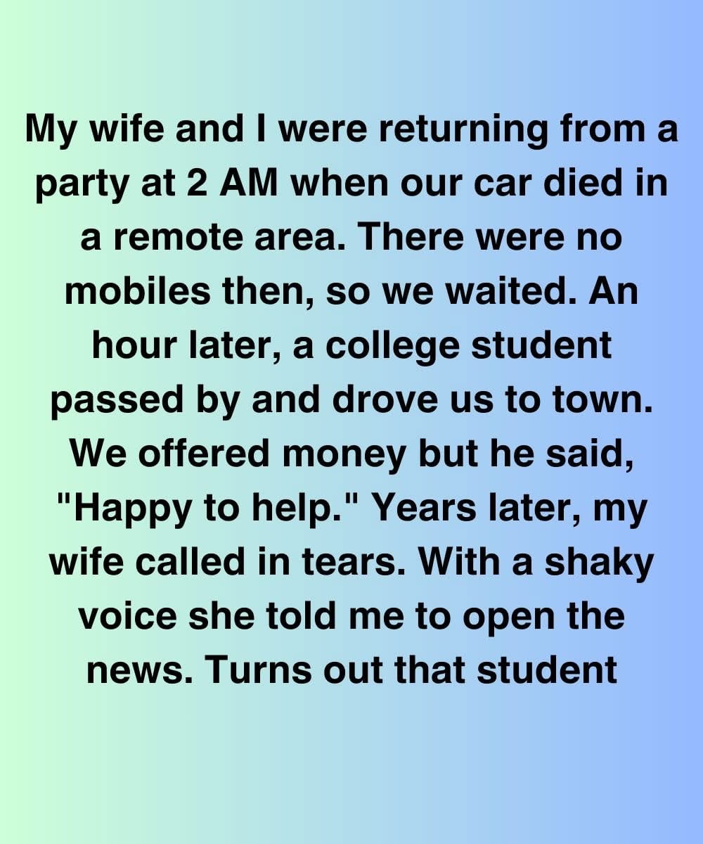 Years later, that memory came rushing back. My wife called me at work and told me to turn on the news. On the screen was the same young man who had once helped us, now a doctor. His story was being told not because of his career, but because he had given his life while saving others. Seeing his face again brought tears to my eyes, reminding me of the genuine kindness he had shown us years before.