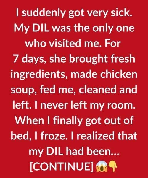 I suddenly got very sick. My DIL was the only one who visited me. For 7 days, she brought fresh ingredients, made chicken soup, fed me, cleaned and left. I never left my room. When I finally got out of bed, I froze. I realized that my DIL had been quietly taking care of the entire house while I was resting—laundry folded, dishes washed, floors cleaned, even fresh flowers placed in a vase by the living room window.