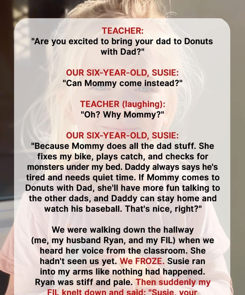 Unbeknownst to her, my husband Ryan, my father-in-law, and I were walking down the hallway at that exact moment and heard every word. We froze. Susie rushed into my arms, blissfully unaware of the emotional impact of her statement. Ryan stood still, his face pale. My father-in-law gently placed a hand on his shoulder and whispered, “She spoke her truth. Now you know what she feels.”