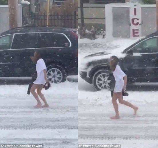 Millions of Americans didn’t even leave their apartments on Saturday during the crippling blizzard. This woman, however, couldn’t have cared less. Perhaps oblivious to the blistering cold, or spurred on by a bet, the unidentified brunette was captured on film running through Morgantown, West Virginia, in nothing but a white T-shirt. The clip was posted online on by West Virginia-based Twitter user Chandlar Fowler, who suggested one reason for the woman’s sparse attire. WATCH THE VIDEO BELOW: