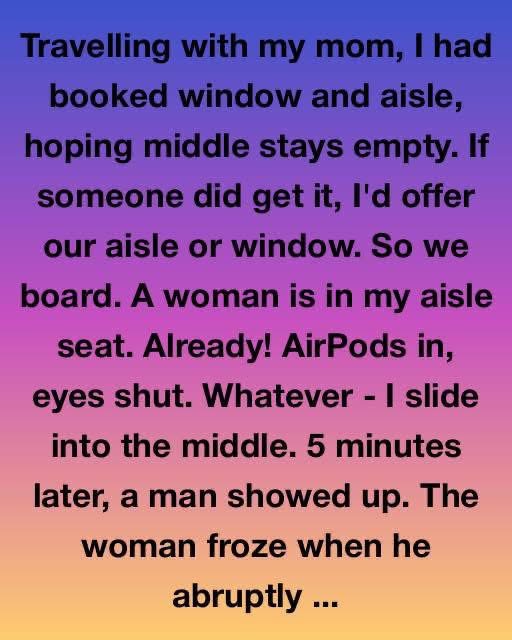 Travelling with my mom, I had booked window and aisle, hoping middle stays empty. If someone did get it, I’d offer our aisle or window. So we board. A woman is in my aisle seat. Already! AirPods in, eyes shut. Whatever – I slide into the middle. 5 minutes later, a man showed up. The woman froze when he abruptly said, “I think that’s my seat you’re in.”