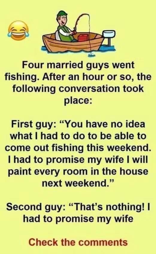 Four married friends—Bill, Tom, Jerry, and Frank—decided to take a much-needed fishing trip together. Between work, family, and the endless to-do lists of married life, the thought of one peaceful day on the water felt like paradise.
