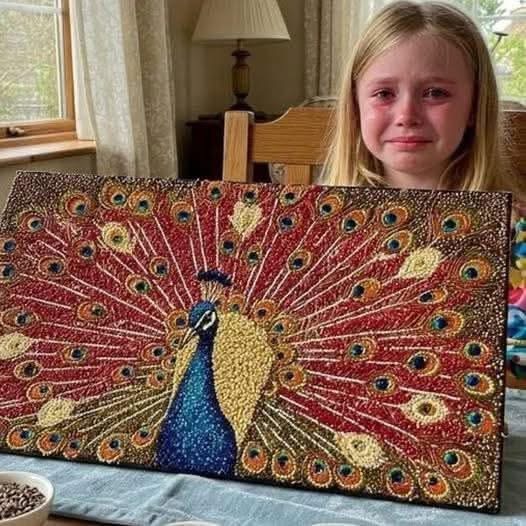 For days, she sat at the wooden kitchen table, her little hands sorting through lentils, beans, peas, rice — each grain becoming a tiny brushstroke of her imagination. The colorful tail feathers took the longest. She arranged them again and again until every seed looked like it belonged exactly where she placed it.